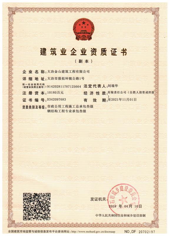 大冶金山建筑工程有限公司始建于1984年,屬鎮辦集體企業(yè)。1997年改制為大冶山建筑工程有限責任公司,屬股份制企業(yè)。2013年更名為大冶金山建筑工程有限公司,2018年3月公司資源重組,公司注冊資金達到10180.00萬元,公司法定代表人為劉瑞華。公司具有古建筑工程專業(yè)承包壹級、建筑工程施工總承包貳級、市政工程總承包叁級、鋼結構工程專業(yè)承包叁級資質。